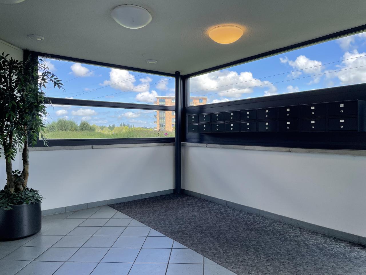 Begane grond: Entree in de centrale hall, waar de brievenbussen, het video-intercomsysteem, het trappenhuis en de lift zich bevinden.