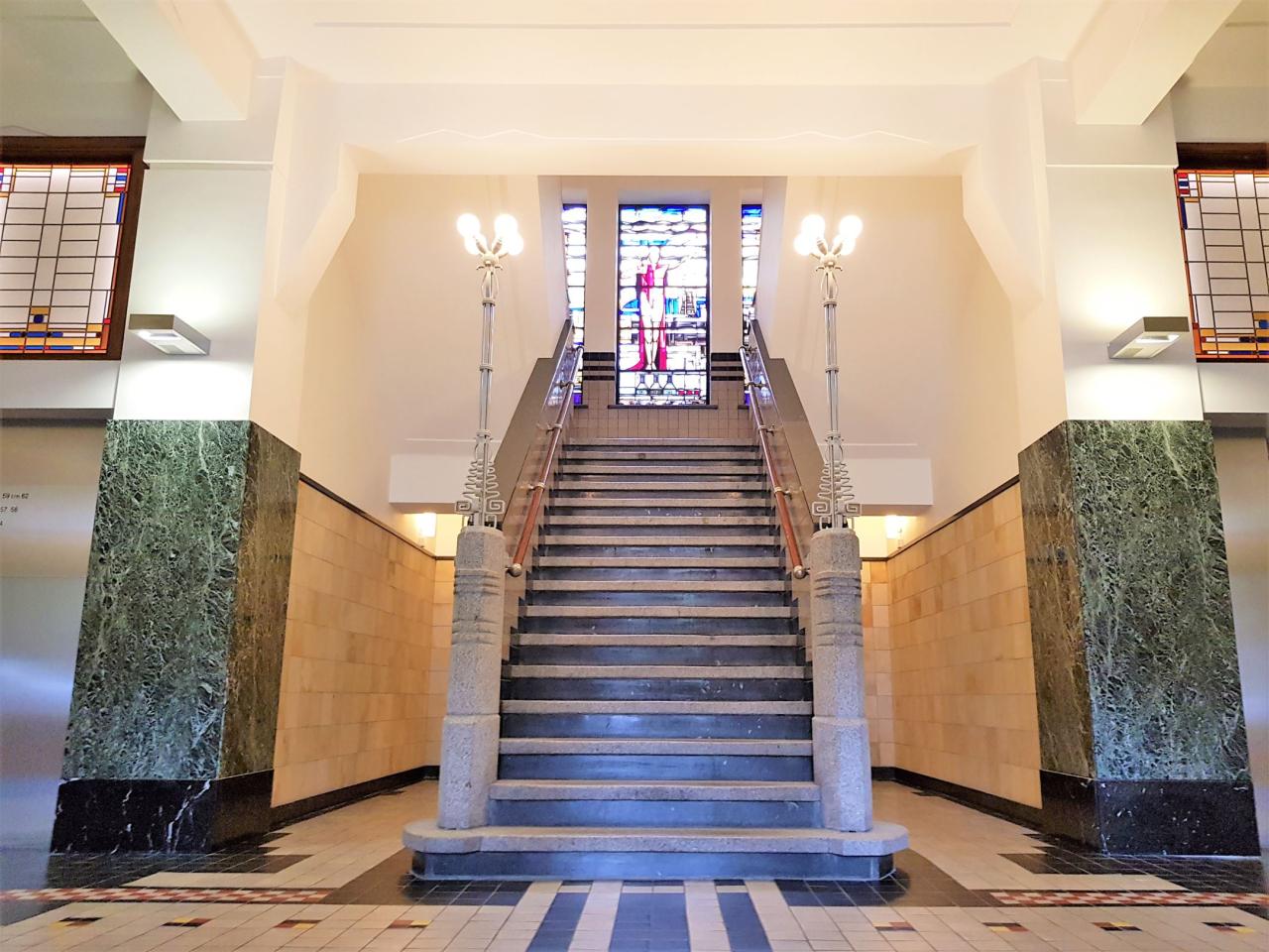 Majestueuze centrale hall met hernieuwde deurpartijen, mozaïekvloer, glas-in-lood raampartijen, monumentaal trappenhuis en toegang tot de liften en de parkeergarage en fietsenstalling.