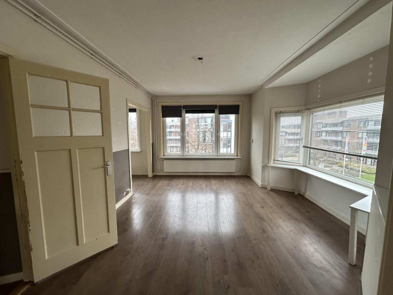 Hal, toilet , de riante woonkamer van de gehele voorzijde tot de achterzijde. Vanuit de achterzijde toegang tot het balkon, aan de voorzijde van de woonkamer nog een halfopen ruimte die ideaal als kantoor of werkruimte gebruikt kan worden. De eenvoudige keuken is gelegen aan de achterzijde en geeft ook toegang tot het balkon.