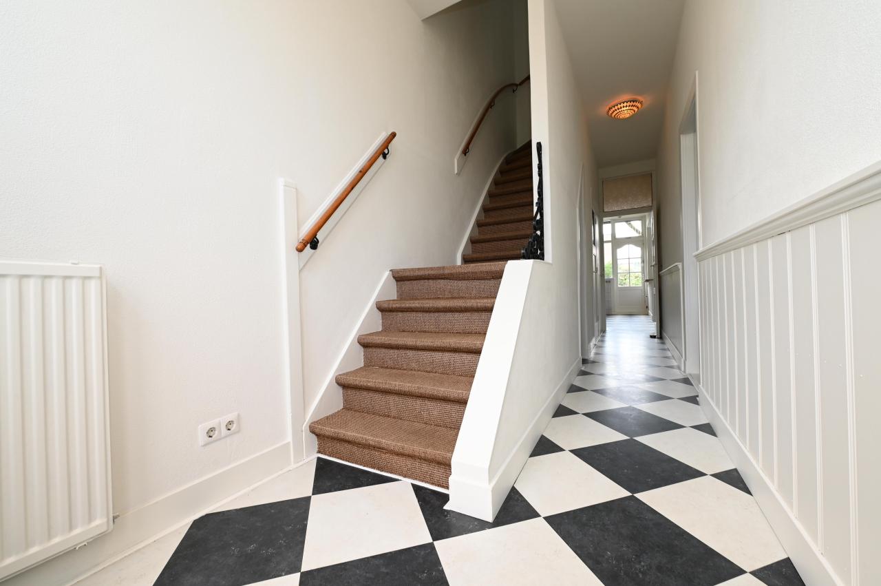 Entree, ontvangsthal, gang met garderobe-nis en apart toilet. Royale woonkamer, afm. ca. 7.40 m x 3.12 m, gelegen aan de voorzijde en voorzien van een sierlijke schouw, grote ramen met uitzicht op de historische singel en ensuite schuifdeuren naar de achterkamer. De achterkamer, oftewel eetkamer, is voorzien van diverse inbouwkasten, een eetbar en open keuken, welke is voorzien van koelkast, vriezer, 5 pits gaskookplaat, afzuigkap, oven, close-in boiler en een vaatwasser. Middels een deur stap je in de riante tuin van ca. 60 m2, gelegen op het Westen/Noordwesten om te kunnen genieten van de middag- en avondzon. In de tuin bevind zich nog een privé berging.