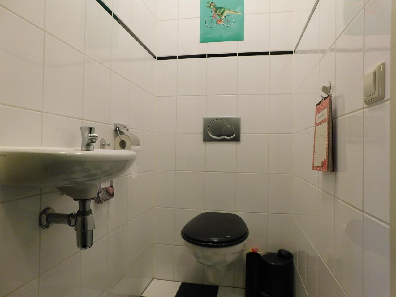 Eerste verdieping: Entree in de ruime hal met inpandige berging, waar de aansluiting voor was- en droogmachine zijn te vinden. Hier bevindt zich tevens het separate toilet met fontein.