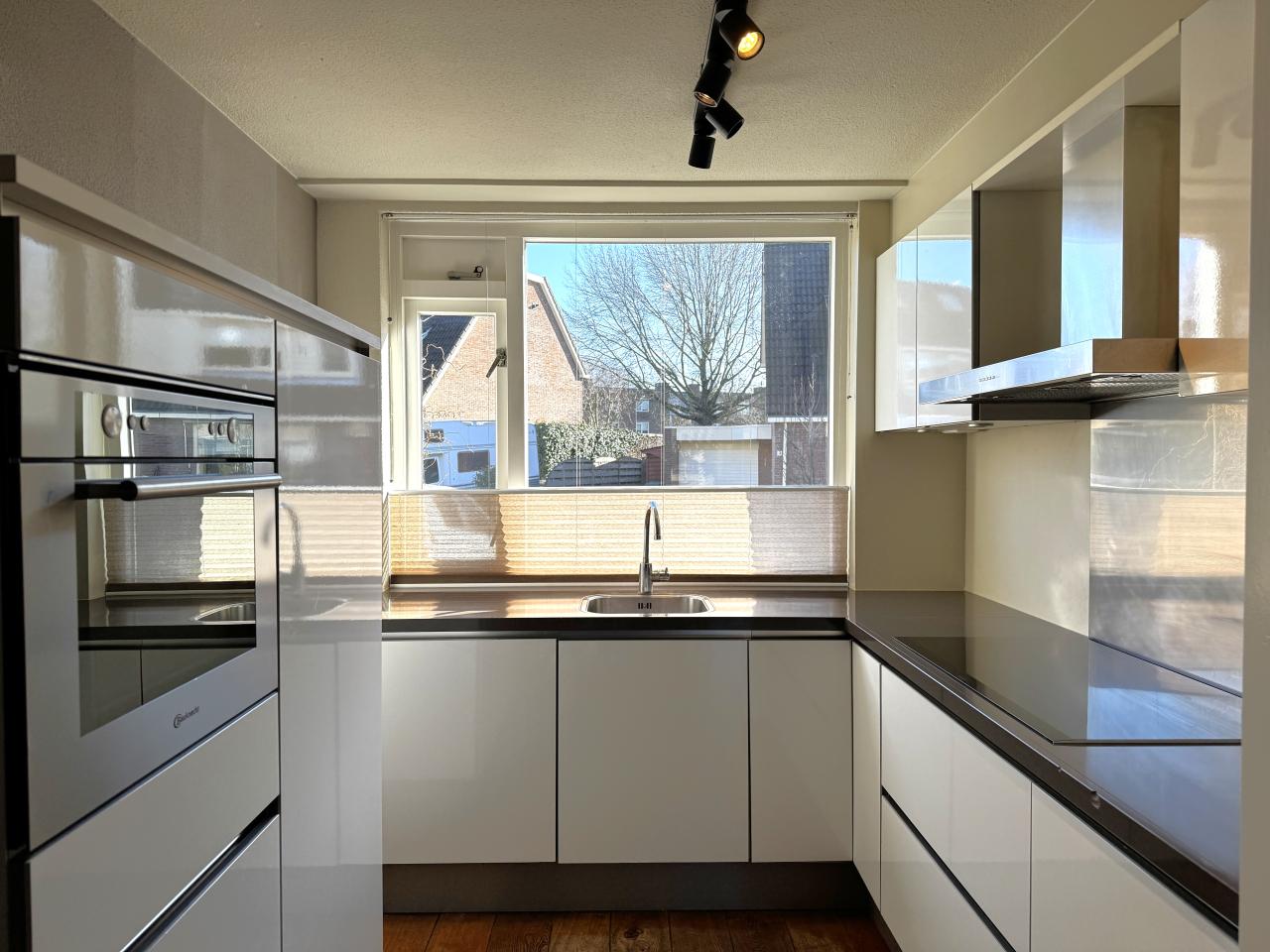 Via de voordeur is de hal te bereiken met de meterkast, een bergkast, toegang tot de woonkamer en de trapopgang naar de verdieping. De woonkamer is door een uitbouw aan de achterzijde ruim opgezet. Er is een gashaard aanwezig. Aan de voorzijde is de moderne keuken gesitueerd. Deze is voorzien van een koelkast, een vriezer, een combi magnetron oven, een vaatwasser, een gaskookplaat en een afzuigkap. Via de woonkamer is de op het westen gerichte achtertuin te bereiken. In de tuin is een berging aanwezig.
