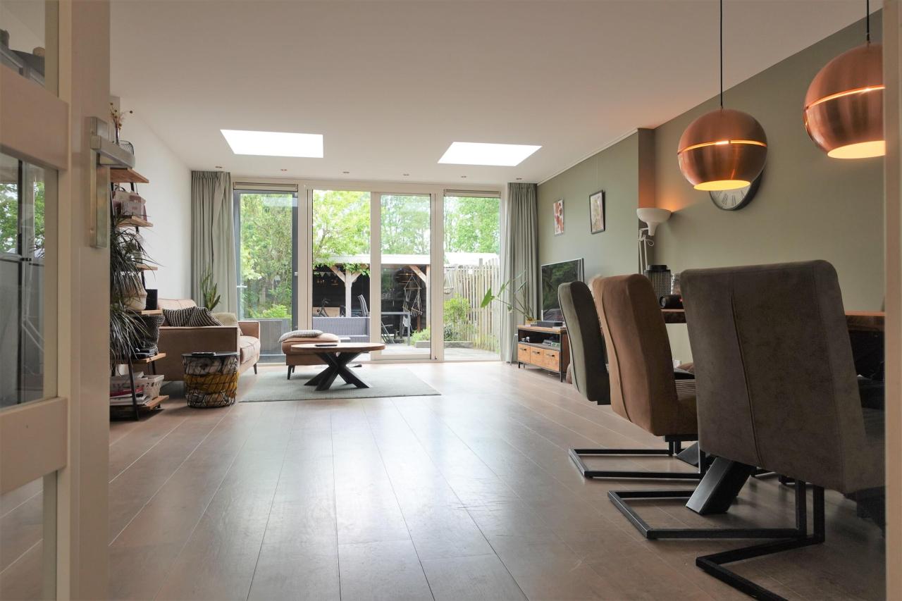Via de entree is de hal te bereiken met de meterkast, de wc, de trapopgang naar de 1e verdieping en de woonkamer. De woonkamer is uitgebouwd, waardoor er veel binnenruimte is. Door de dakramen en de glazen pui met openslaande deuren naar de achtertuin is het een heerlijk lichte ruimte. Aan de voorzijde is de moderne keuken gesitueerd met uitzicht op de voortuin en de straat. De keuken is voorzien van: een koelkast, een vriezer, een oven, een vaatwasser, een gaskookplaat, een afzuigkap en een Quooker.