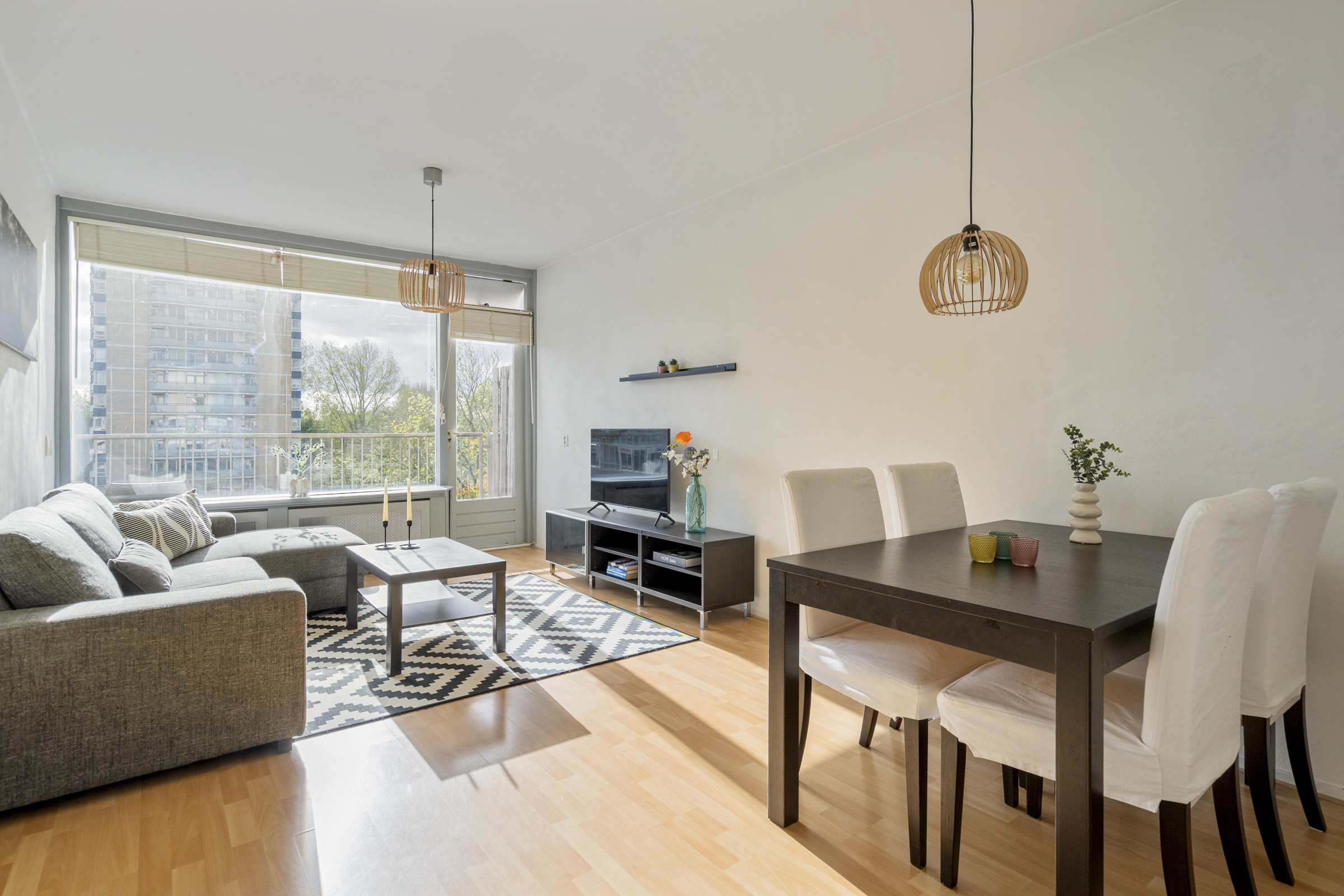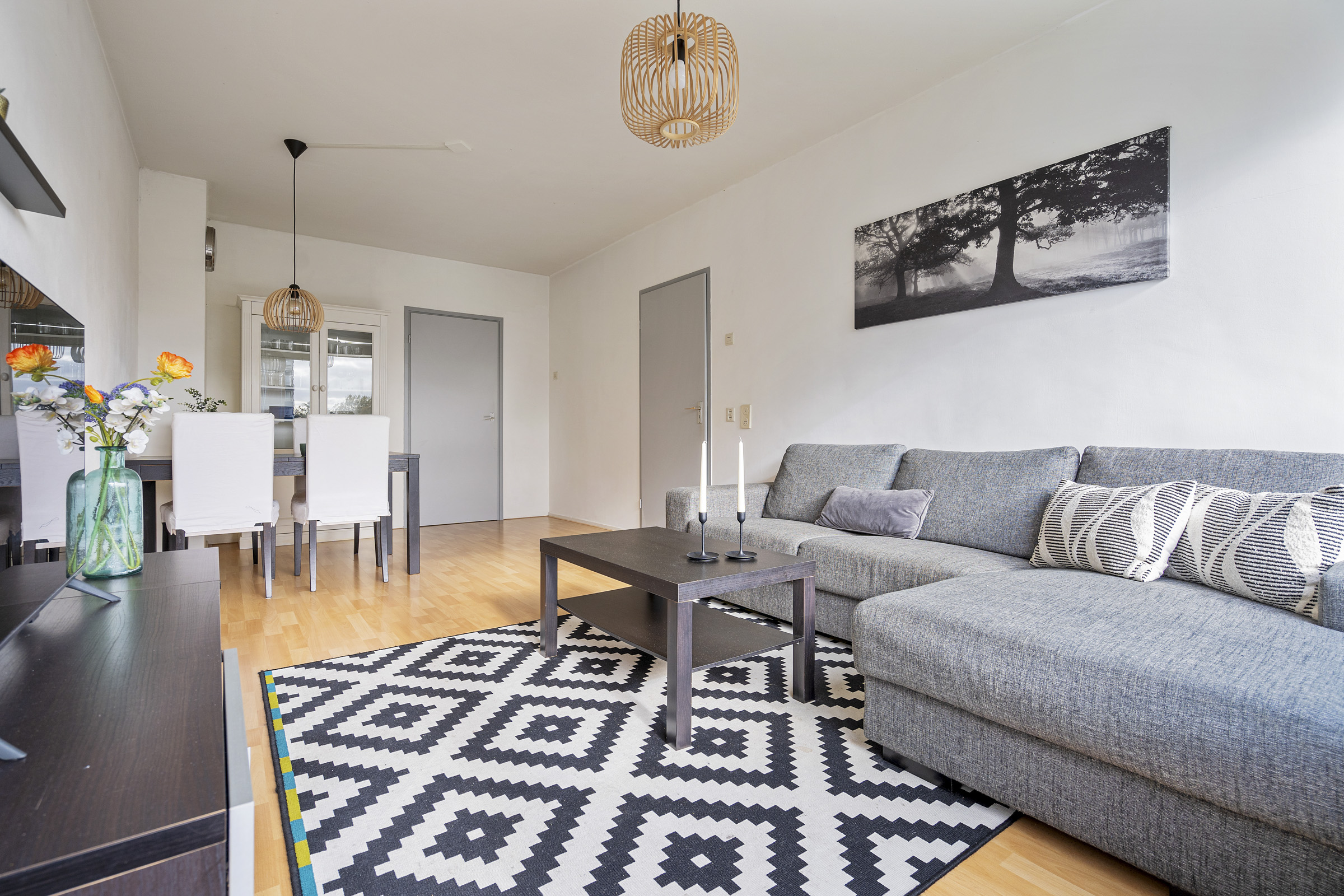De woonkamer is ruim en licht dankzij de grote raampartijen en het vrije uitzicht richting het groen. Vanuit de woonkamer stap je direct het balkon op – perfect voor een kop koffie in de ochtendzon of een borrel aan het einde van de dag.