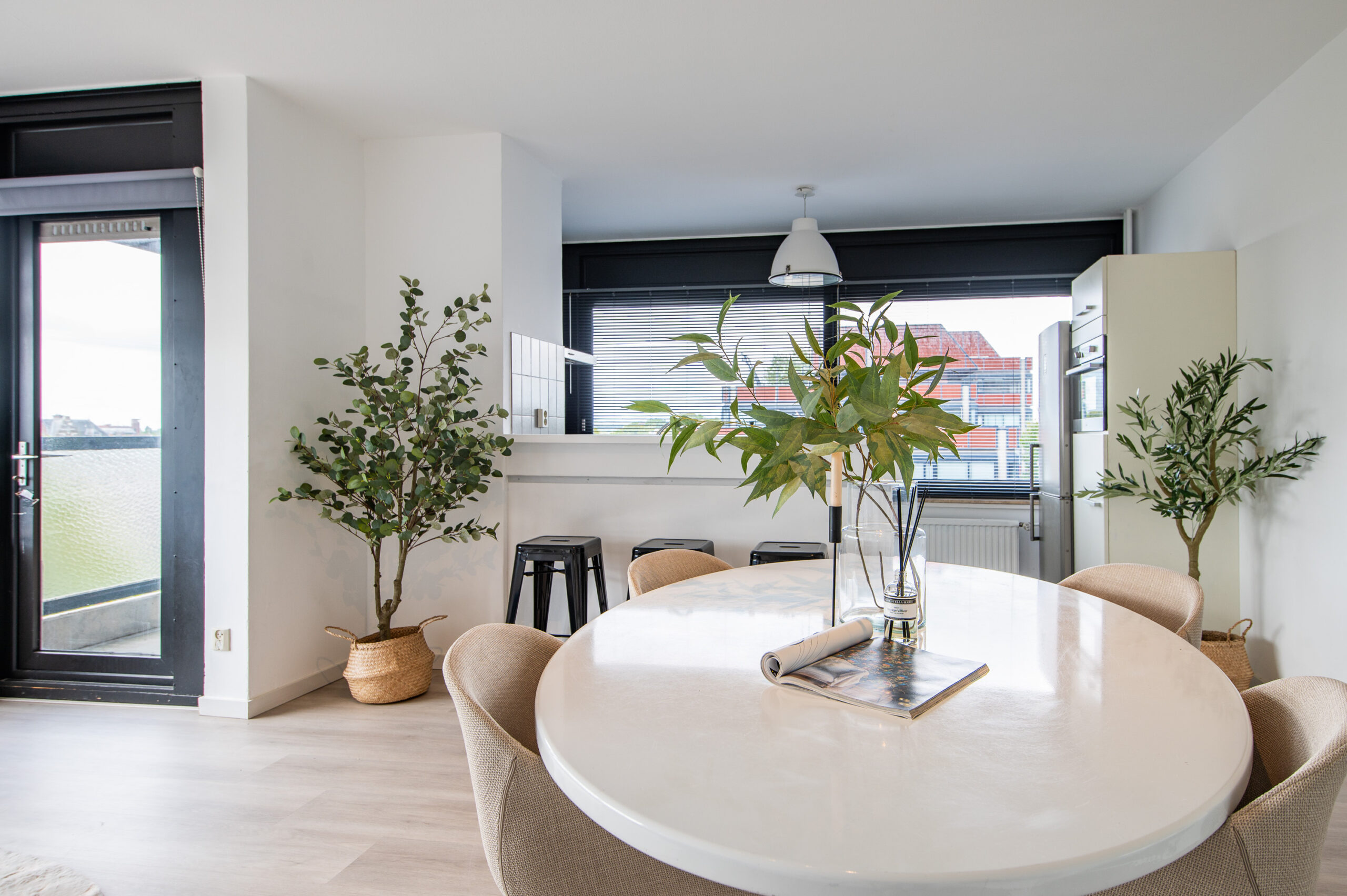 The living room is spacious and flooded with natural light, offering panoramic views over Haarlem. The modern open kitchen comes with a stylish worktop, cooktop, extractor, and built-in appliances including a combi oven and dishwasher.