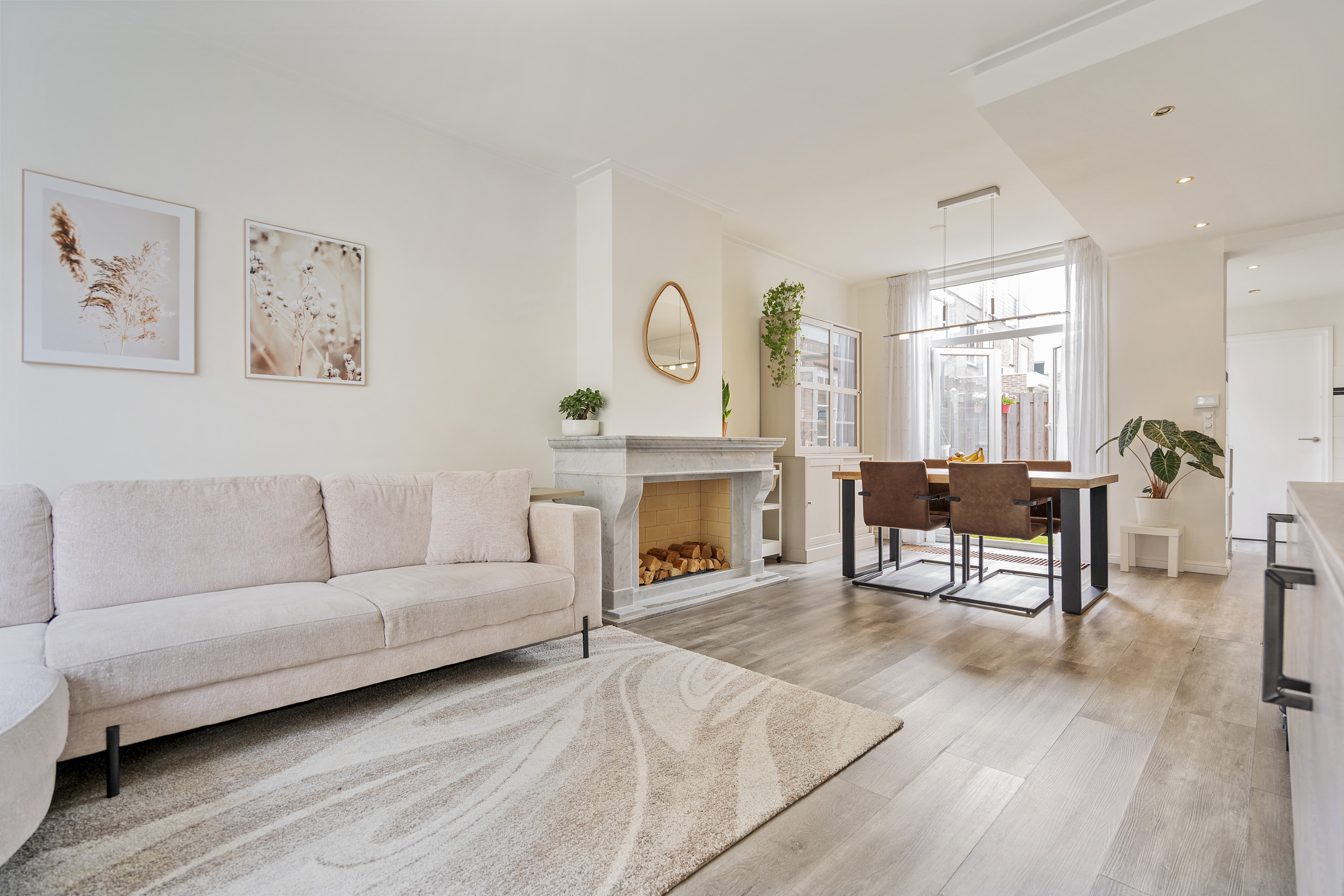 Entrance, hallway with toilet and staircase. The bright living room offers ample space for both a comfortable seating area and a dining table. The kitchen is functionally designed and connects directly to the rear garden.