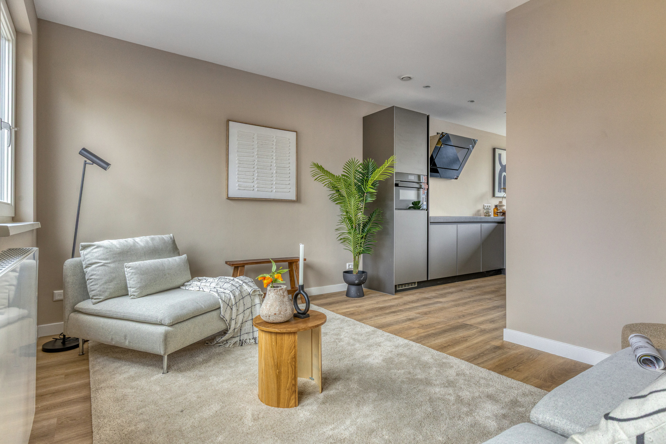 Entree woning, gezamenlijke hal met trapopgang en toegang het appartement. Je komt binnen in de zonnige woonkamer met open keuken. De luxe keuken in moderne en warme kleurstelling is voorzien van inbouwapparatuur zoals een inductiekookplaat, afzuigkap, magnetron, een vaatwasmachine en een koelkast. Het stenen werkblad is breed en dient als ontbijtbar, heerlijk genieten dus voor de kookliefhebber en de liefhebber van kookliefhebbers! Vanuit de keuken toegang tot het dakterras, de vergunning om dit balkon te gebruiken (20 m2) is inmiddels verleend, er wordt na definitieve gunning een balustrade geplaatst. Op de twee ‘artist impressions’ foto;s kun je een impressie zien van hoe het balkon eruit ziet als er een balustrade is geplaatst.
