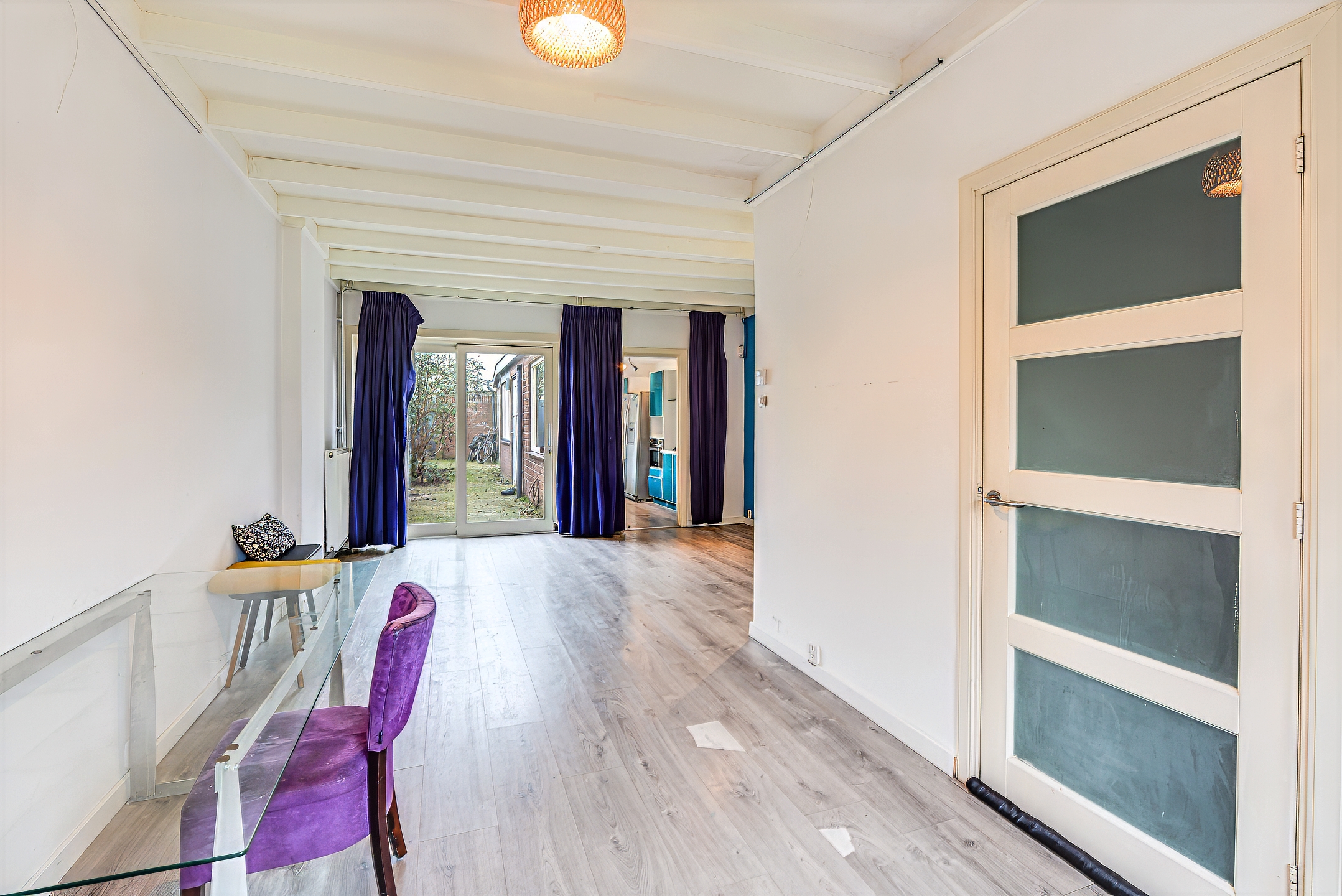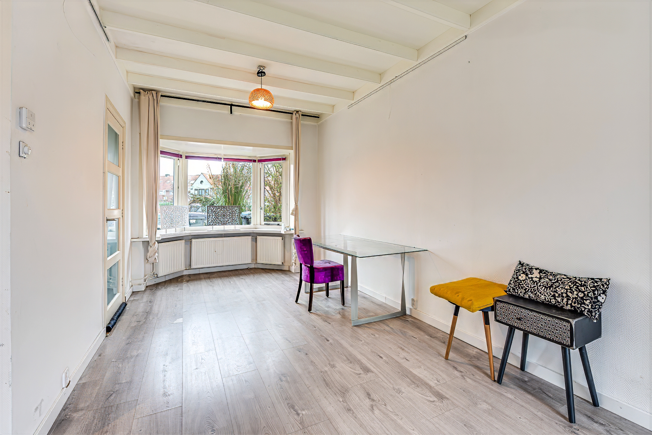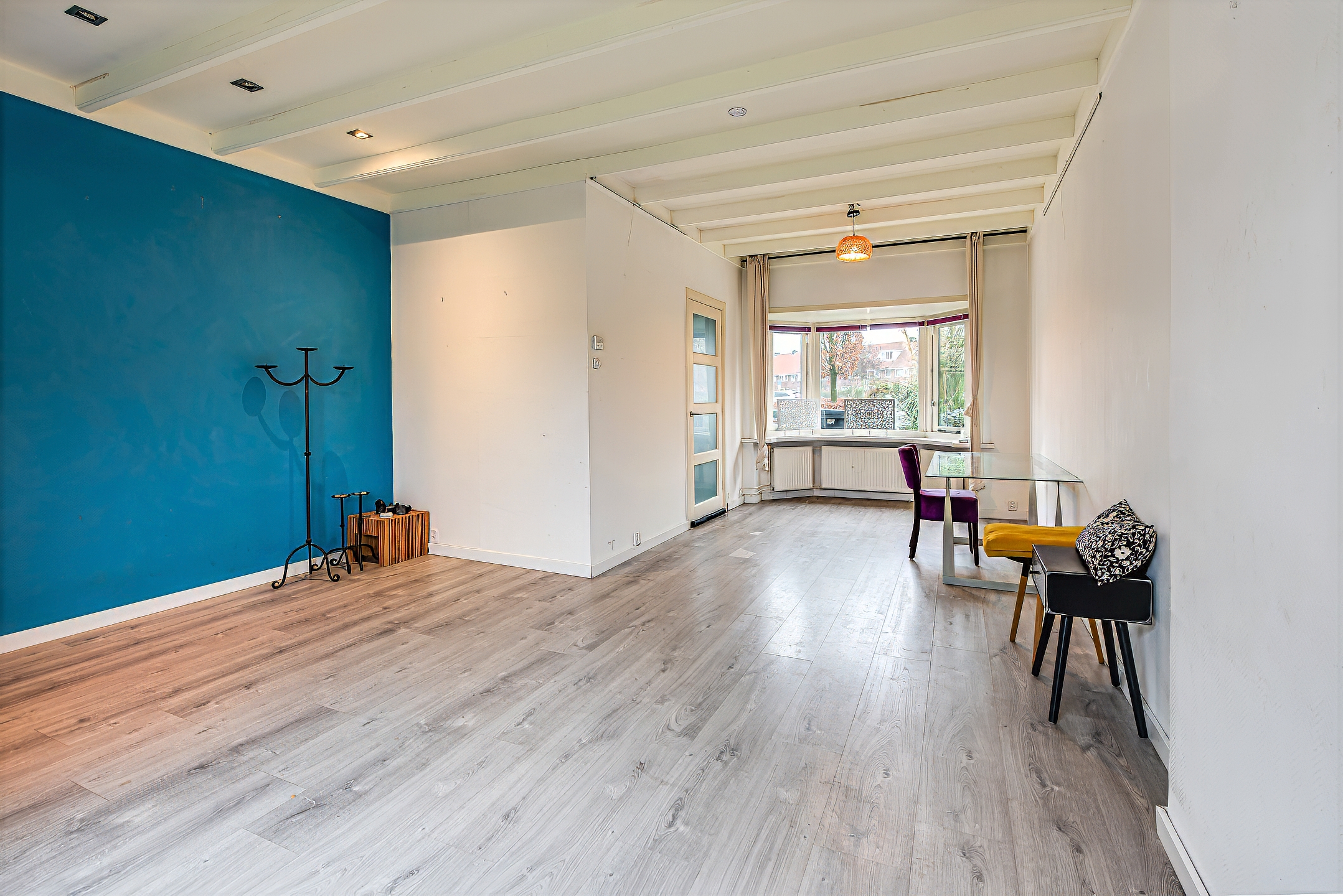Entrance hall with staircase and toilet, providing access to the living room. The bright, L-shaped living room features sliding doors that open onto the rear garden. The kitchen is fitted with various appliances. At the rear of the house, in the extension, there is a multifunctional studio space with a kitchenette, shower room, and toilet. This space is accessible both through the kitchen and via its own private entrance, making it ideal for a home office or practice space.