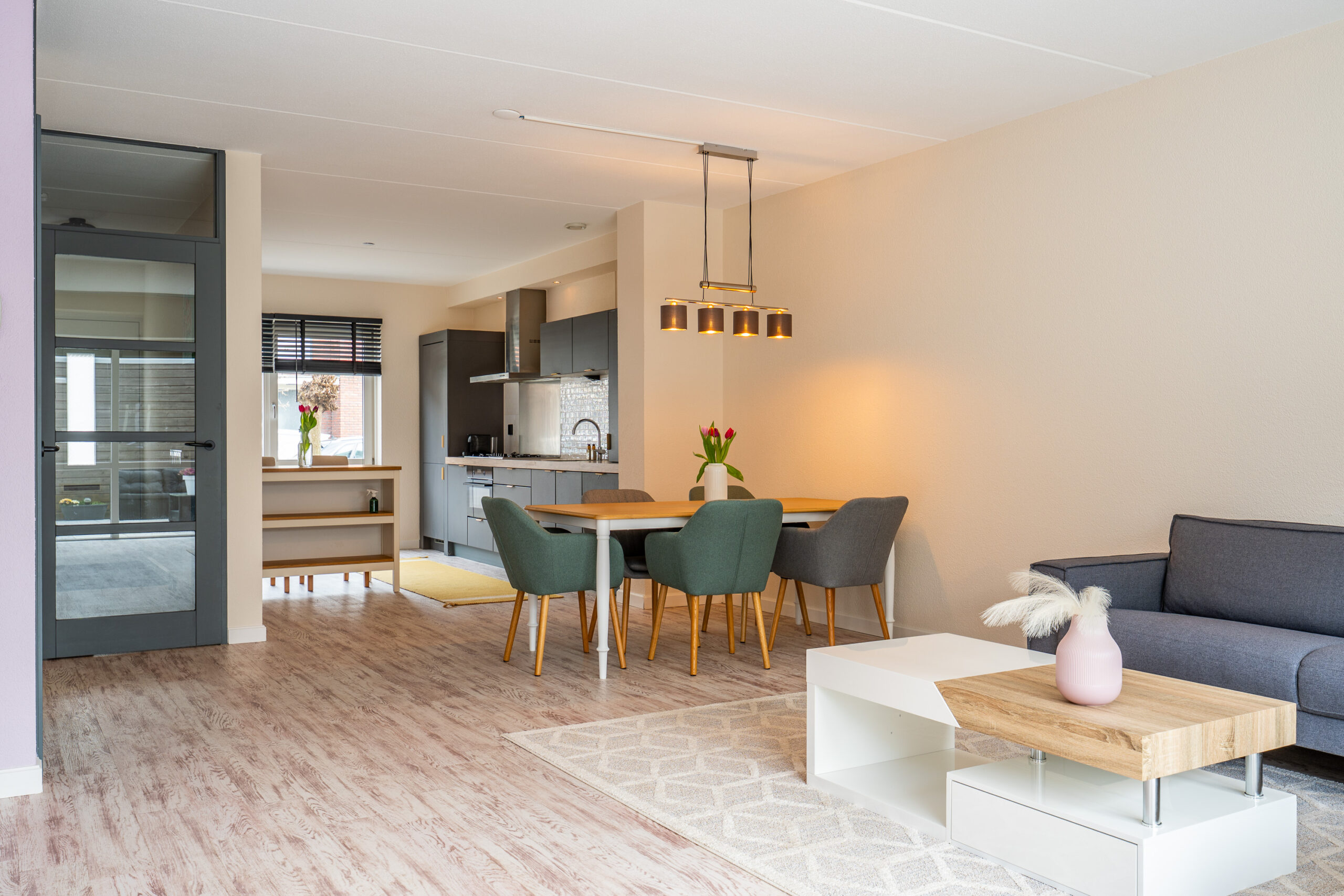De ruime woonkamer is erg licht door het vele glas aan de achterzijde en de ligging. De woonkamer is voorzien van een fraaie pvc vloer en vloerverwarming. Voorts een praktische trapkast en de doorgang naar woonkeuken.