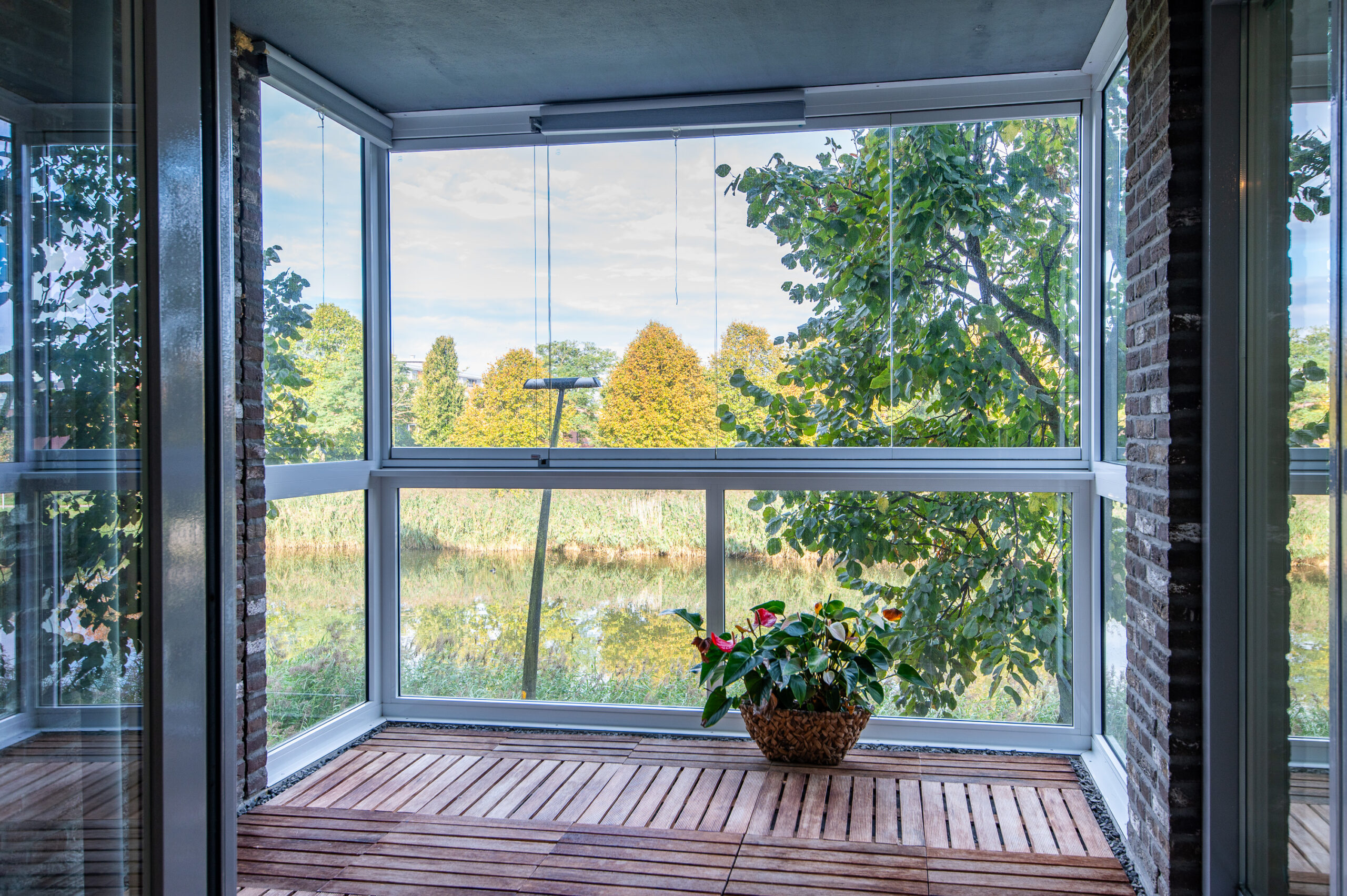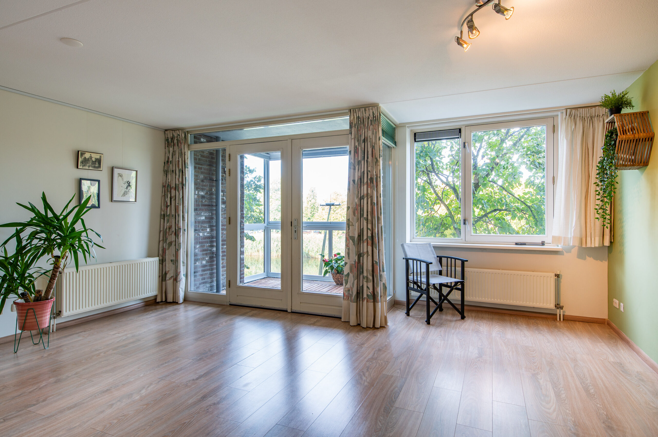 Lichte woonkamer aan de voorzijde met rustig en vrij uitzicht op veel groen en water. Vanuit de woonkamer, middels dubbele deuren, toegang tot de loggia die indien gewenst, door middel van een glazen wand, geheel is af te sluiten.