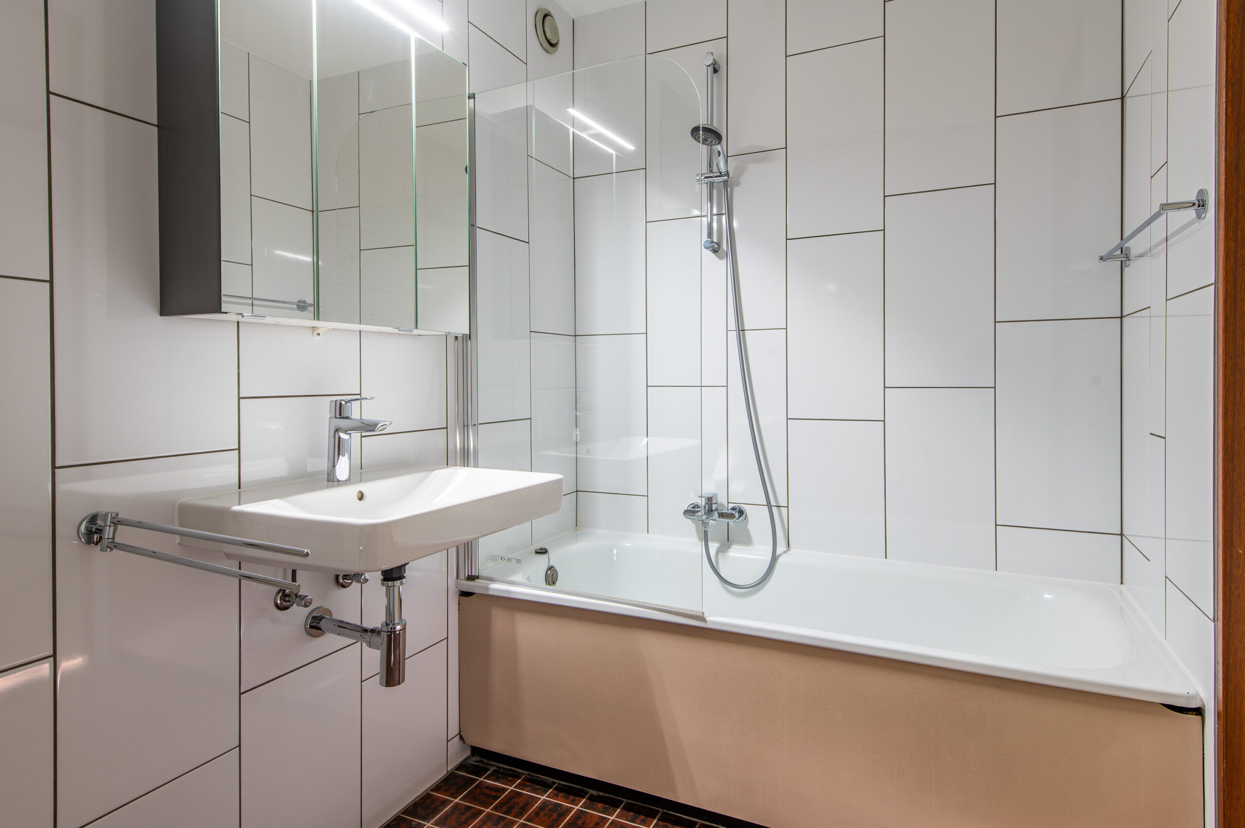 Recent geïnstalleerde badkamer met ligbad/douchecombinatie, wastafel en aansluitingen voor de wasmachine.