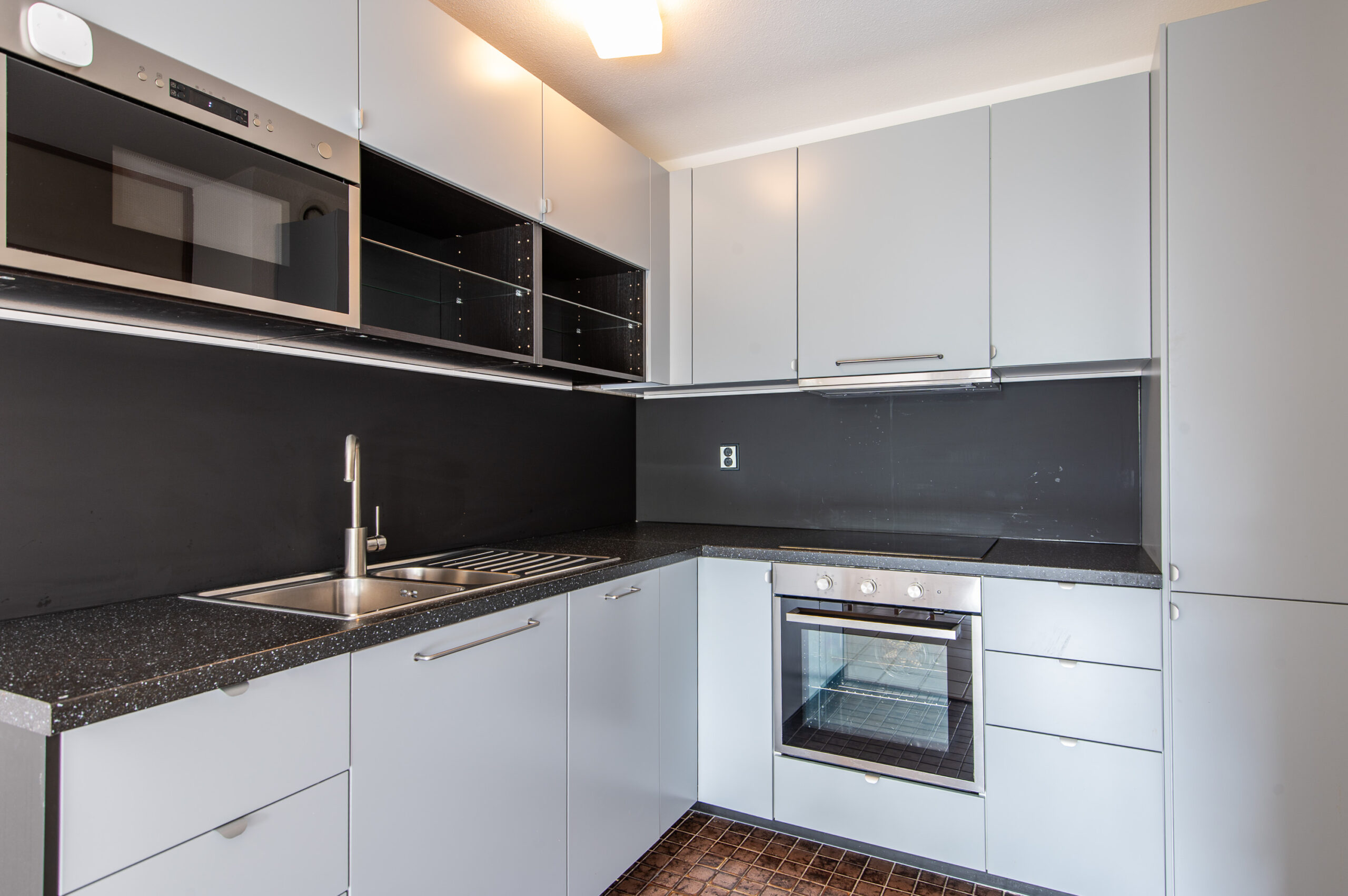 The recently renovated semi-open corner kitchen is equipped with various built-in appliances, including a dishwasher, oven, microwave, induction cooktop, and extractor hood.