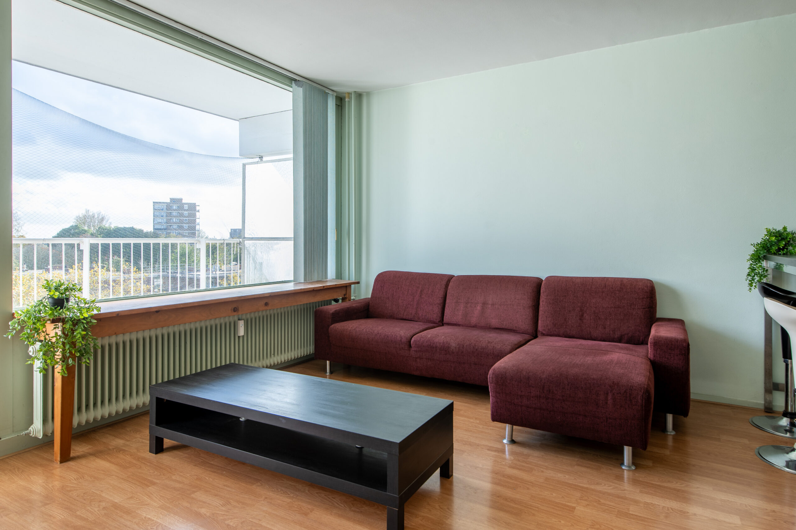 Ruime en lichte woonkamer met open keuken aan de voorzijde. Vanuit de woonkamer en het kamerbrede zonnige (Z-O) balkon is er uitzicht over de gehele wijk.
