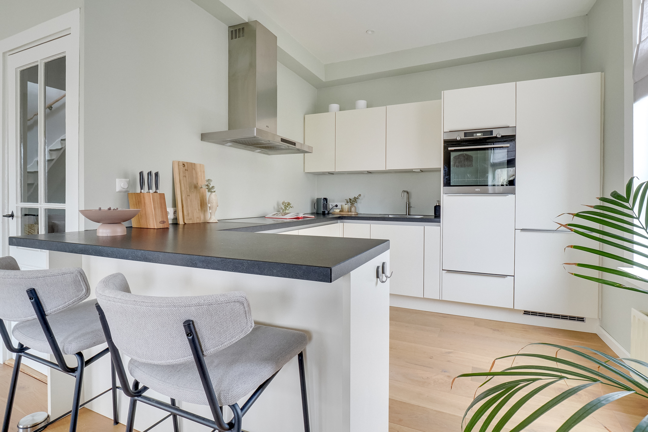The spacious landing provides access to the toilet, the living room, and the staircase to the second floor. The bright and tastefully furnished living room offers a pleasant view over the playground at Bankaplein and is a wonderful place to relax. Adjacent is the modern, semi-open kitchen, fully equipped with a refrigerator, freezer, oven, dishwasher, induction cooktop, extractor hood, and a Quooker. The cozy breakfast bar makes the kitchen an ideal space for both cooking and socializing.